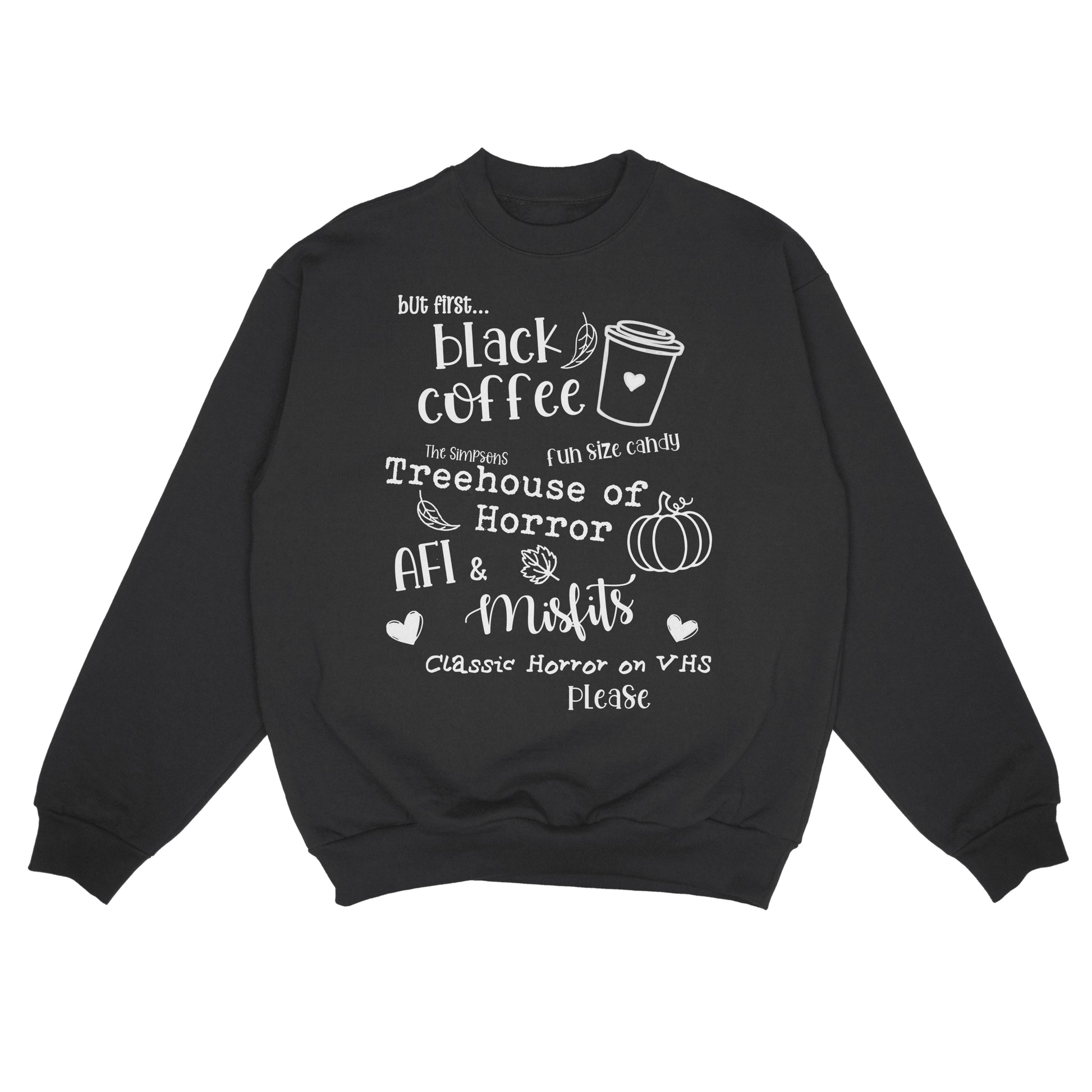 White print on a black Gildan heavy cotton blend crewneck.