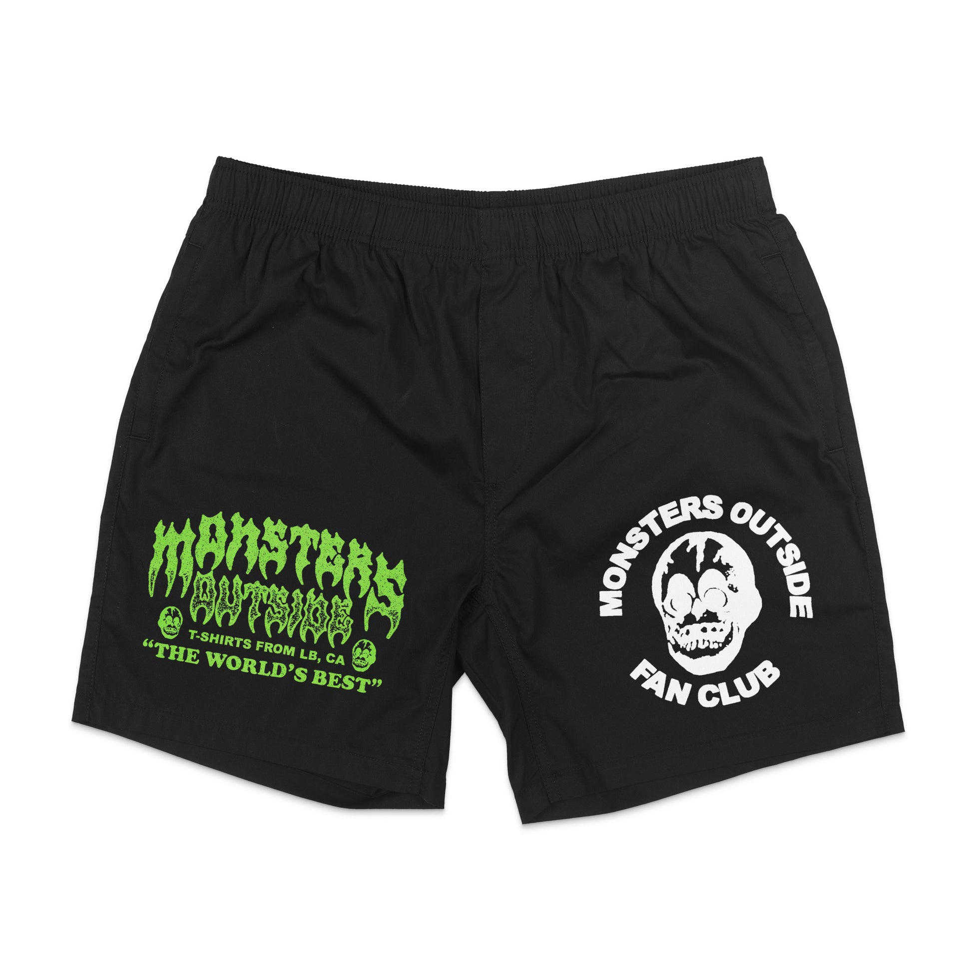 Bright green and white print on black AS Colour Beach Short. Sits above knee, can be worn at waist or pulled up for high waisted fit.