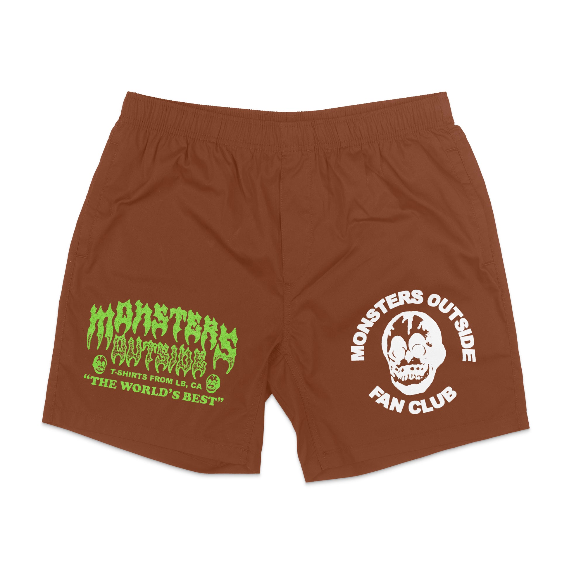 Bright green and white print on clay AS Colour Beach Short. Sits above knee, can be worn at waist or pulled up for high waisted fit.