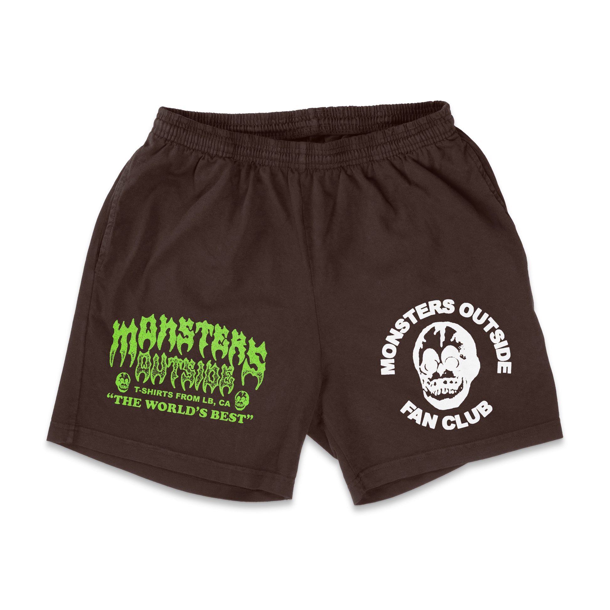 Bright green and white print on chocolate Los Angeles Apparel Heavy Gym Short. Sits above knee, can be worn at waist or pulled up for high waisted fit.
