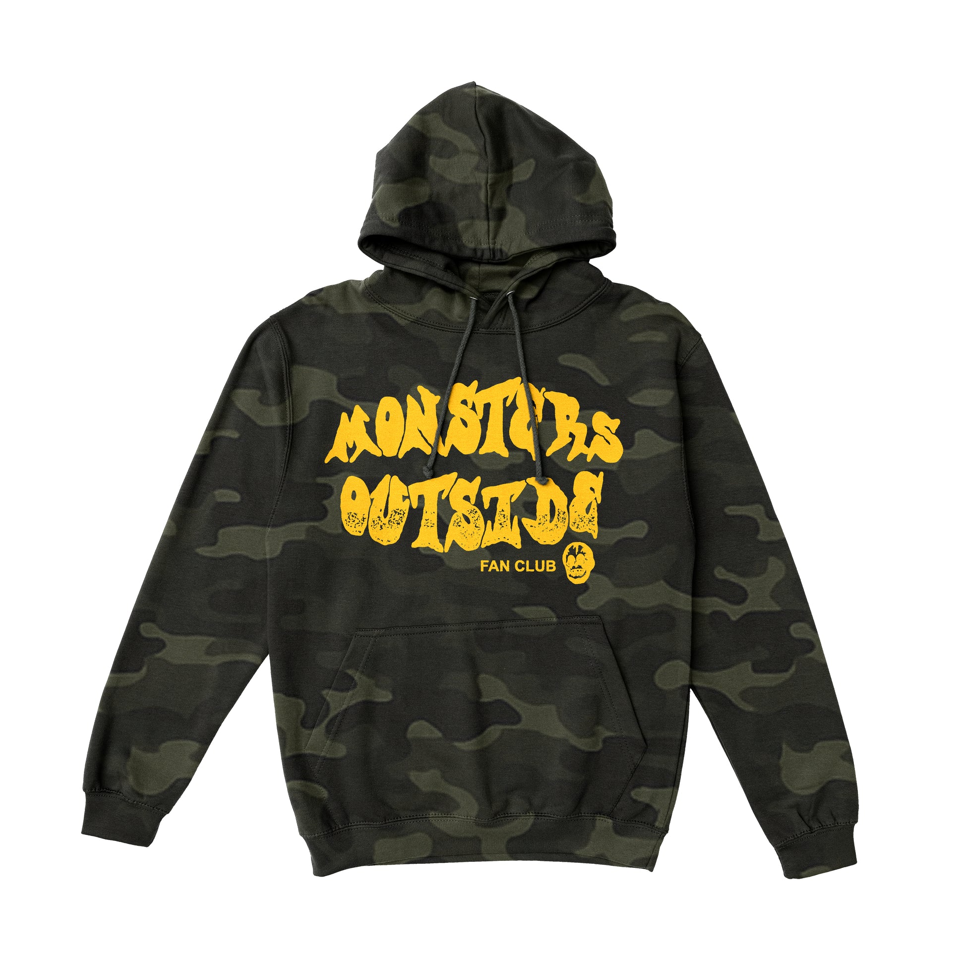 Golden yellow print on a forest camo color IND4000 heavyweight cotton blend hoodie.
