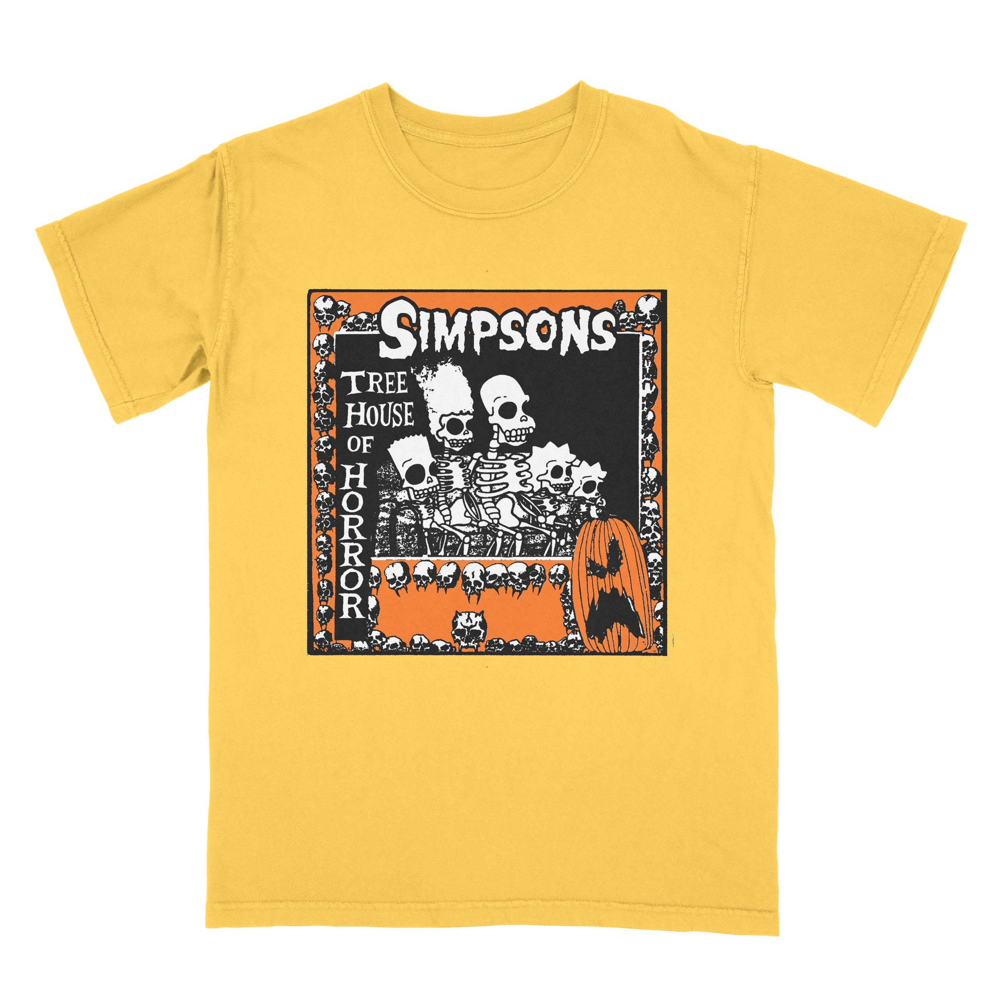 Black, white and orange print on a gold cotton tee.