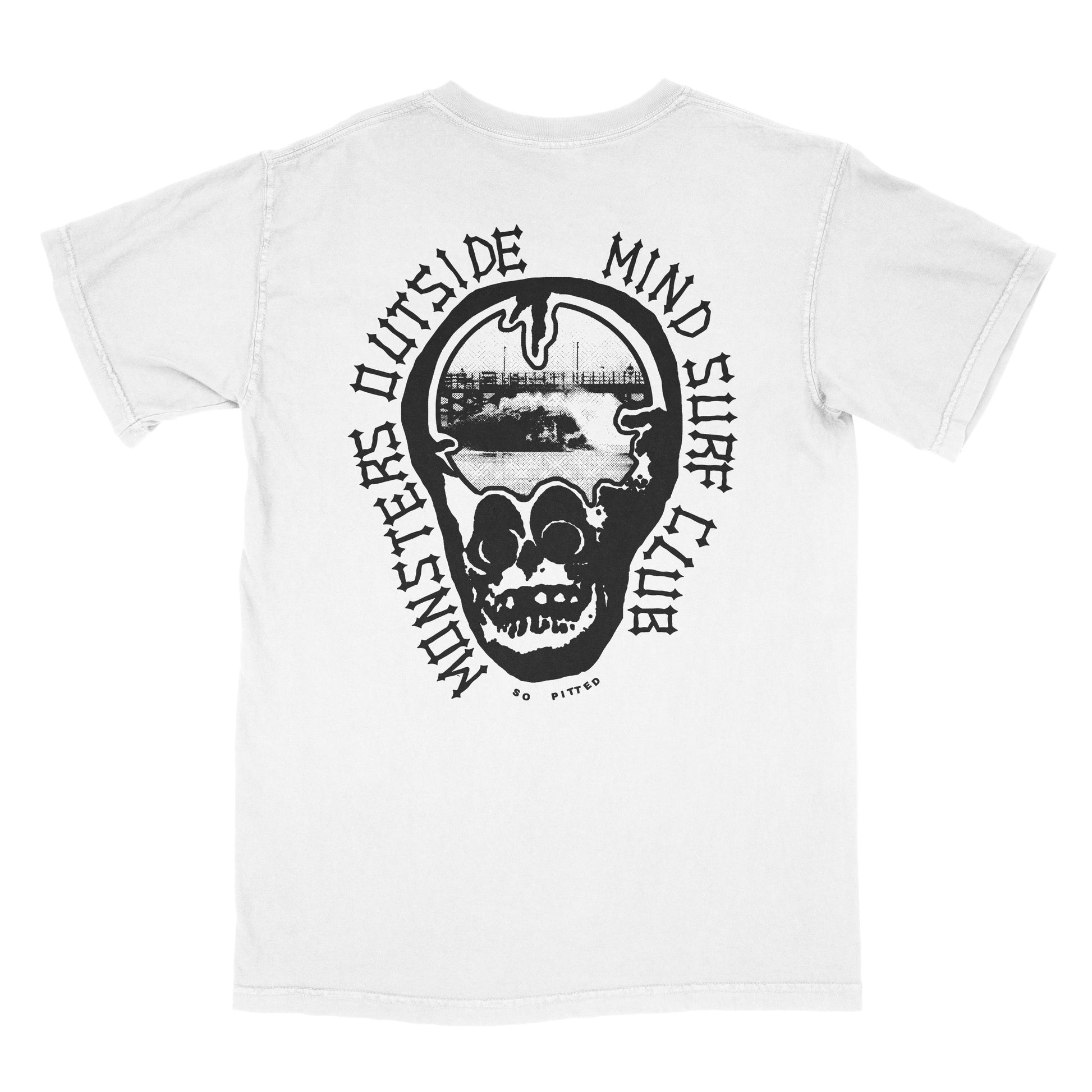 Black print on a white cotton tee.