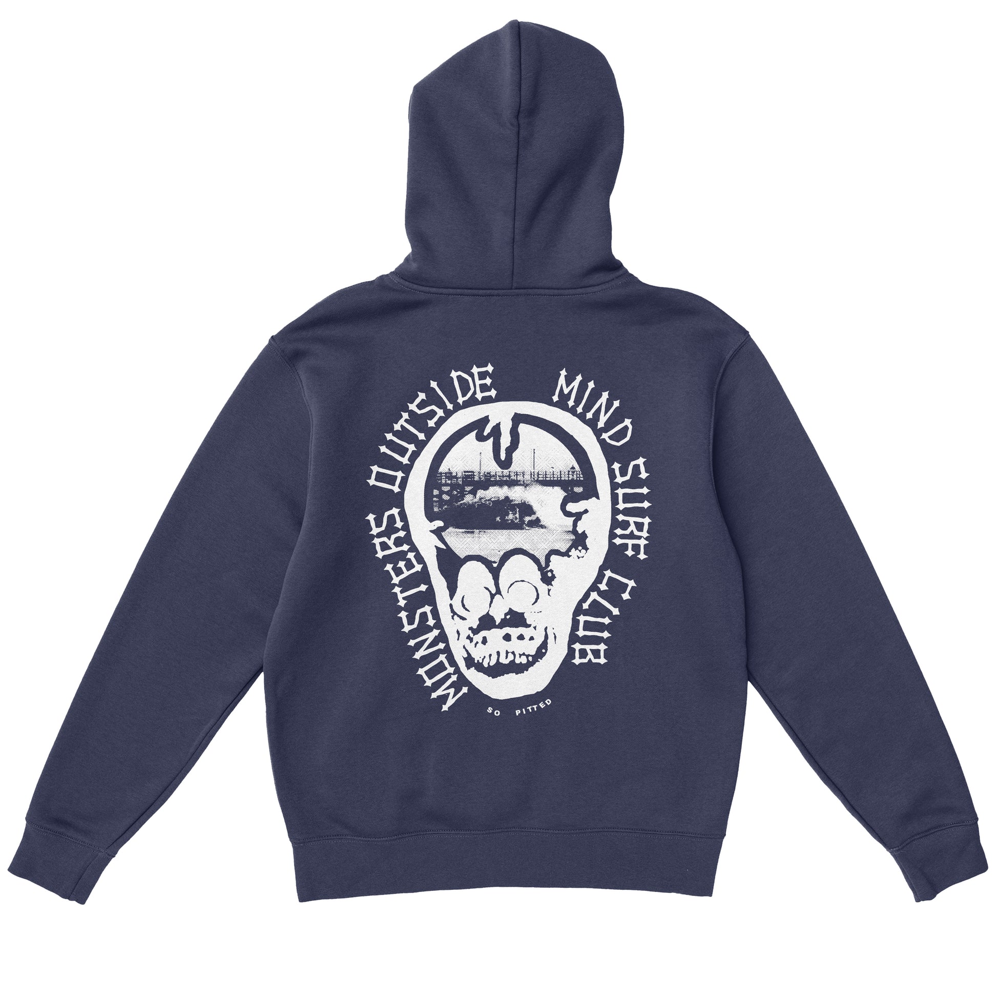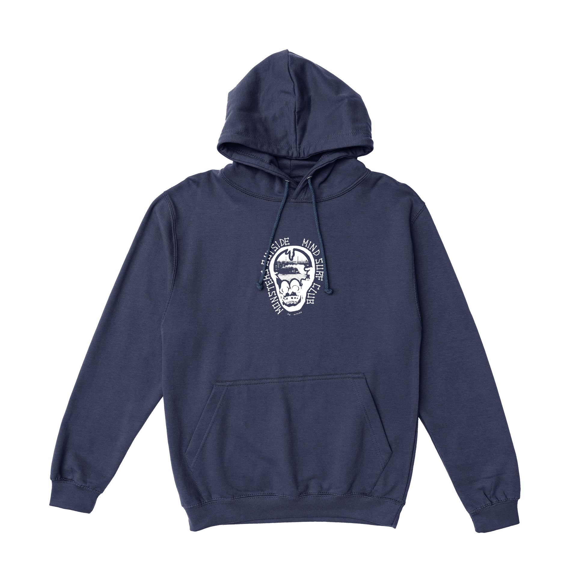 White print on a slate blue color IND4000 heavyweight cotton blend hoodie.