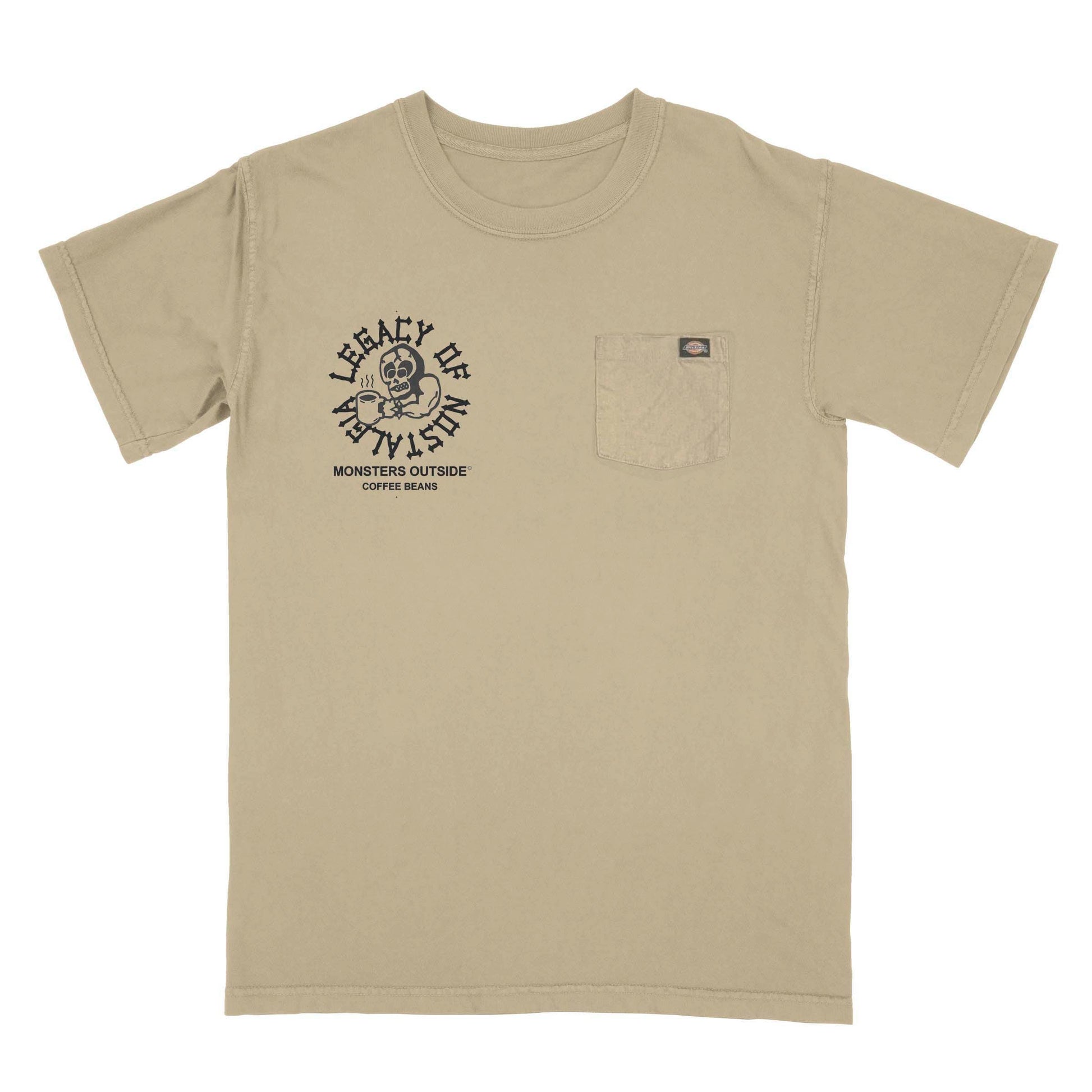 Black print on a khaki Dickies Heavyweight Pocket tee.